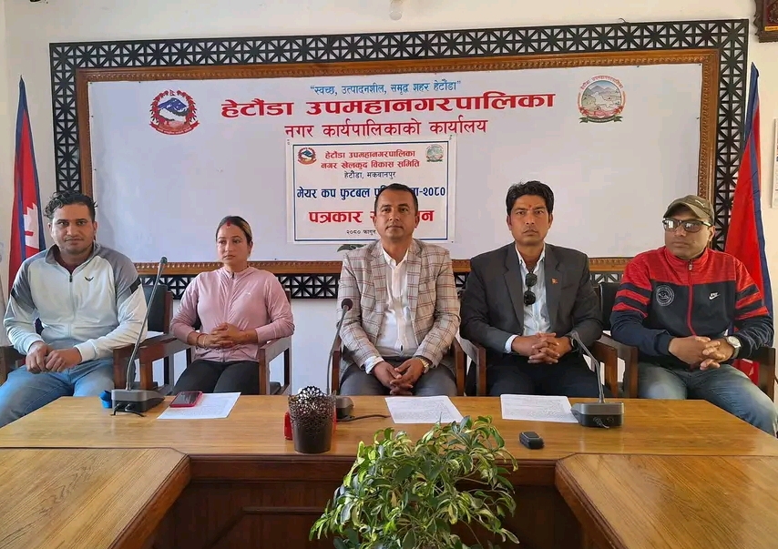 रोशन दिप –  बागमती प्रदेशको राजधानी हेटौडामा आउँदो चैत २४ गतेबाट चौंथो संस्करणको वडास्तरीय मेयर कप फुटबल प्रतियोगिता हुने भएको छ । हेटौडा उपमहानगरपालिकाको सहयोगमा तथा नगर खेलकुद विकास समितिको आयोजनामा प्रतियोगिता हुने भएको हो । मंगलबार दिउँसो उपमहानगरपालिकाको सभाहलमा पत्रकार सम्मेलनको आयोजना गर्दै नगर खेलकुद विकास समितिका अध्यक्ष रवीन्द्र प्रसाद घिमिरेले प्रतियोगिताबारे जानकारी दिएका छन् ।