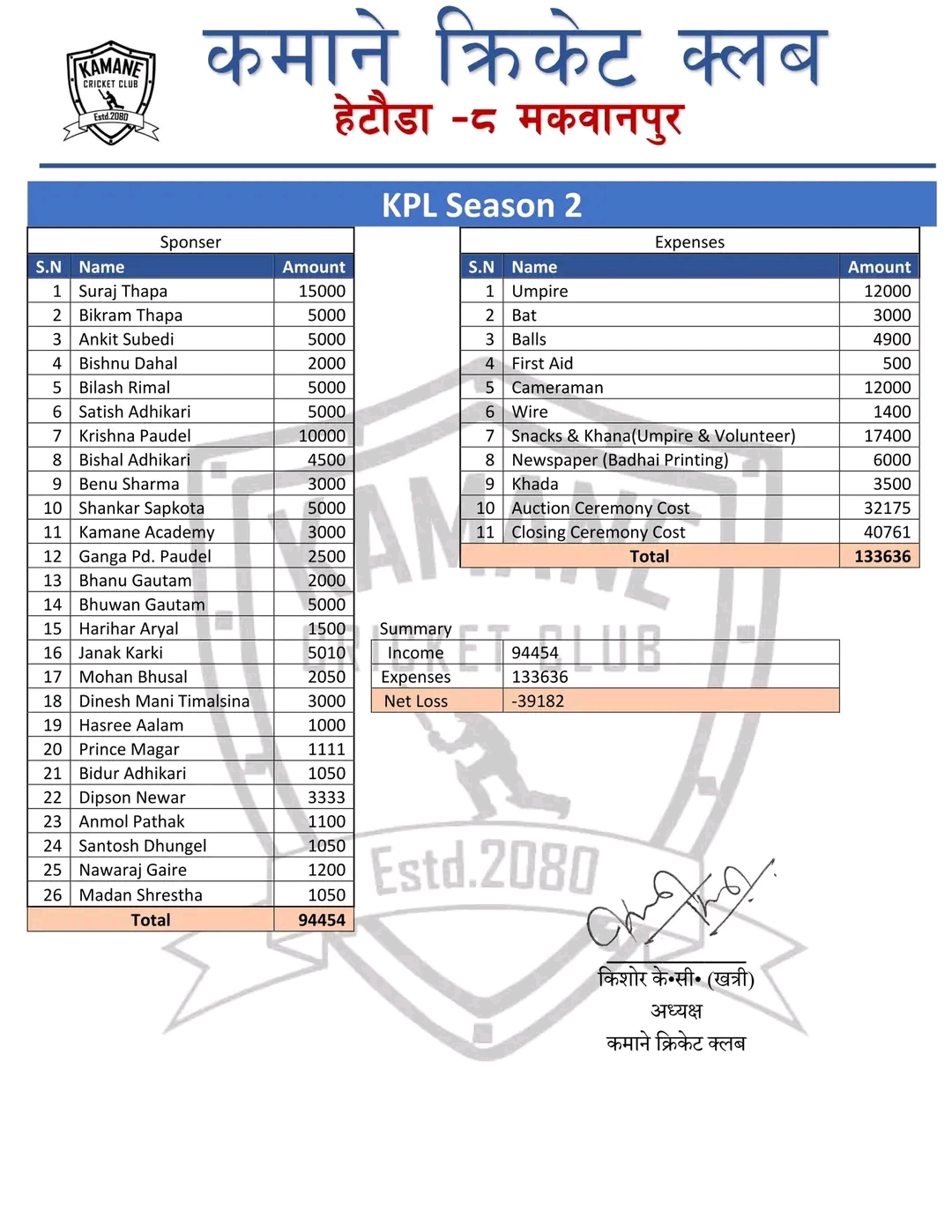 उनका अनुसार दोस्रो संस्करणको प्रतियोगिता विवरण पनि यस वर्षनै सार्वजानिक गरिएको छ । क्लबले सार्वजानिक गरेको विवरण अनुसार तेस्रो संस्करणको प्रतियोगितामा ३ लाख ९३ हजार २ सय ५० रुपैयाँ आम्दानी र ३ लाख ९२ हजार २ सय ९५ रुपैयाँ खर्च भएको अध्यक्ष खत्रीले बताएका हुन् । क्लबमा ७० हजार रुपैयाँ उठ्न बाँकी रहेको उनले बताए ।