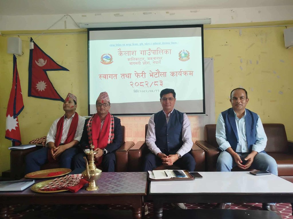 कार्यक्रममा गाउँपालिका उपाध्यक्ष बालकुमार मल्लल कैलाशमा गरेको काम कतर्व्य प्रति आभार व्यक्त गर्दै उनले सरुवा भई आउनु भएका प्रमुख प्रशासकीय अधिकृत शर्मालाई कैलाश गाउँपालिकामा स्वागत गरेका छन् । गाउँपालिकाका अध्यक्ष लोकबहादुर मुक्तानको सभाध्यक्षतामा भएको कार्यक्रममा उपाध्यक्ष बालकुमार मल्ल, प्रमुख प्रशासकीय अधिकृतद्ध रामप्रसाद शर्मा कंडेल लगायत गाउँपालिकाका कार्यरत शाखाका प्रमुख तथा कर्मचारीहरुको उपस्थिति रहेको थियो ।
