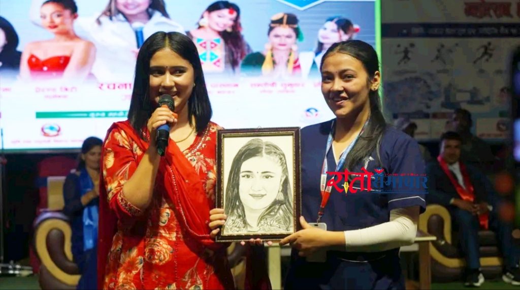 हेटौंडा । चर्चित गायिका रचना रिमाललाई हेटौंडामा चित्र उपहार प्रदान गरिएको छ । मकनपुर जिल्ला खेलकुद विकास समितिको आयोजनामा हेटौडा १० स्थित टिसिएन् चौरमा जारी दोस्रो बृहत खेलकुद तथा कृषि पर्यटन महोत्सवमामा सोमबार आफ्नो सांगीतिक प्रस्तुति दिन आएकी चर्चित गायिका रचना रिमाललाई उनकै चित्र बनाएर उपहार स्वरुप उक्त चित्र प्रदान गरिएको हो ।