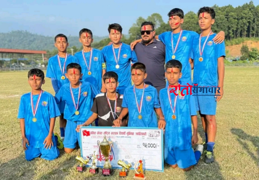 हेटौंडा । हेटौंडा उपमहानगरपालिका वडा नम्बर–७, नागस्वतीस्थित तासिर इंग्लिस बोर्डिङ्ग स्कूलले पहिलो संस्करणको अखिल (क्रान्तिकारी) कप यु–१६ ७ ए साइड फुटबल प्रतियोगिताको उपाधि जितेको छ । मंगलबार हेटौंडा–५,पिप्लेस्थित पिप्ले–क्याम्पा रंगशालामा भएको फाइनल खेलमा रस्सल एकेडेमी बोर्डिङ्गलाई १–० गोलले हराउँदै तासिर इंग्लिस बोर्डिङ्ग स्कूलले १६ वर्ष उमेर समूहको अखिल क्रान्तिकारी कप विद्यालयस्तरीय फुटबल प्रतियोगिताको उपाधि चुमेको छ ।