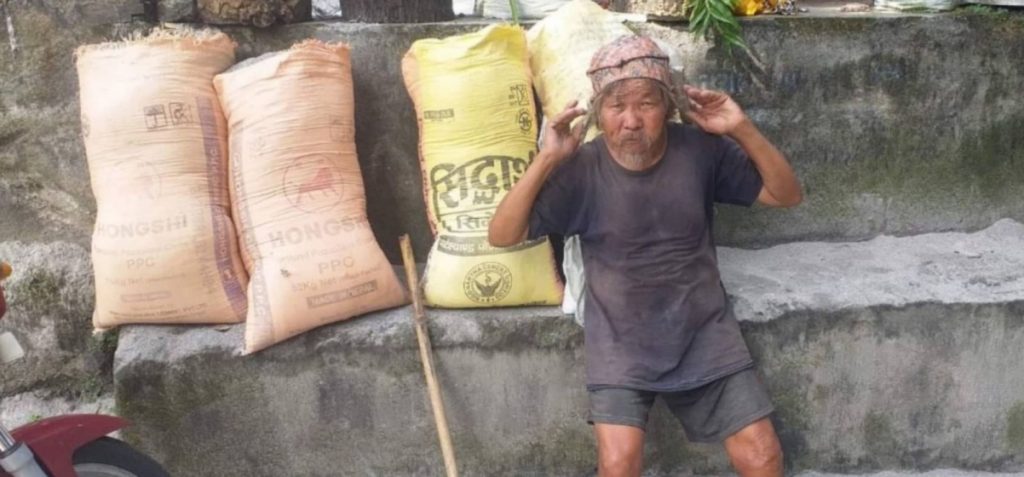 टाउकोभरि नाम्लाको नील डाम। पाइतालामा चप्पल छैन, थोत्रा कपडा, कुप्री पर्दै, एक हातमा लौरो र अर्को हातले सिँढीको फलामे रेलिङको सहयता लिँदैै। न हातले नाम्लो समाउनु छ। आइतबार दसैँकै दिन पोखराको शान्तिघाटबाट ५० केजी बालुवा बोरामा बोक्दै डिलमा उतार्र्दै थिए लम्जुङ जिल्लाका ७० वर्षीय साइँला गुरुङ।