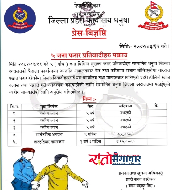 हेटौंडा । धनुषा जिल्लाका प्रहरीले विभिन्न मुद्दामा फरार रहेका प्रतिवादीलाई पक्राउ गरेको छ । पक्राउ पर्नेमा कर्तव्य ज्यान मुद्दामा ३ जना, सार्वजानिक अपराधका १ जना र हाहतियार खरखजनाका मुद्दामा फरार रहेको १ जना प्रतिवादी रहेका छन् । जिल्ला अदालत धनुषाबाट तोकिएको कैद तथा जरिवाना सजायको वरदाता पश्चात फरार यस प्रहरी कार्यालयबाट खटिएको प्रहरी टोलीले खोज तलास गर्ने क्रममा बुधबार पक्राउ गरेको हो । कर्तव्य ज्यान मुद्दामा पक्राउ परेका ३ जनालाई ५ वर्षको सजाय हुनेगरी जिल्ला अदालत धनुषाले फैसला सुनाएको थियो ।