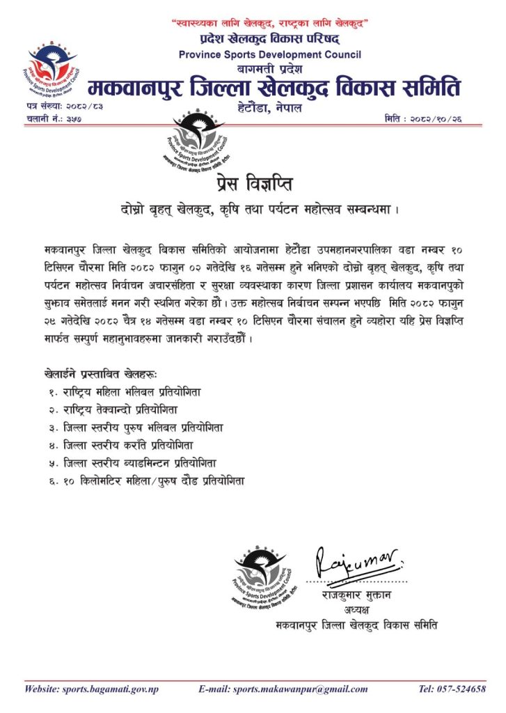 तर निर्वाचन आचारसंहिता र सुरक्षा व्यवस्थालाई मध्यनजर गर्दै जिल्ला प्रशासन कार्यालय मकवानपुरको सुझाव अनुसार महोत्सव स्थगित गर्ने निर्णय गरिएको समितिले जनाएको छ ।जिल्ला खेलकुद विकास समिति मकवानपुरका अध्यक्ष राजकुमार मोक्तानले सोमबार एक सूचना जारी गर्दै निर्वाचन सम्पन्न भएपछि उक्त महोत्सव फागुन २९ गतेदेखि चैत्र १४ गतेसम्म सञ्चालन गर्ने जानकारी गराएका छन् ।