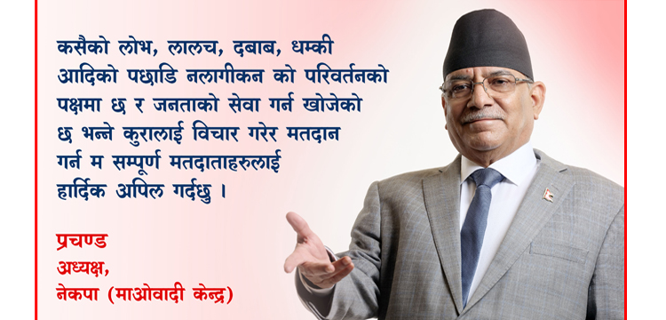 प्रचण्डले अहिलेको निर्वाचन विगतको भन्दा फरक भएको र अहिले प्रतिगमनलाई परास्त गरी संघीय गणतन्त्रलाई संस्थागत गर्ने निर्वाचन भएकाले परिवर्तनका पक्षधरलाई नै मत दिएर जिताउन पनि आम मतदातालाई अपील गर्नुभएको छ ।