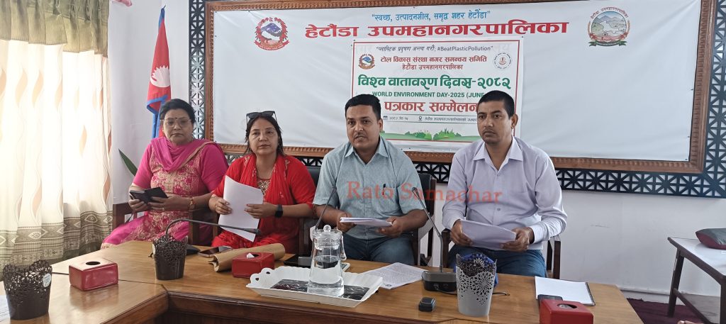 हेटौंडा । हेटौंडा उपमहानगरपालिकाको टोल विकास नगर समन्वय समितिले विश्व वातावरण दिवसको अवसरमा विविध कार्यक्रम गर्ने भएको छ । बिहीबार आयोजित पत्रकार सम्मेलन मार्फत टोल विकास नगर समन्वय समितिका अध्यक्ष धूर्व अधिकारीले भोलि शुक्रबारबाट एक सातासम्म सप्ताहव्यापी कार्यक्रम गर्न लागेको जानकारी गराएका छन् । प्यालिष्टक प्रदुष्ण नियन्त्रण गरौं भन्ने मूल नाराका साथ भोलि जेठ १६ गतेबाट जेठ २२ गतेसम्म ५६ औँ विश्व वातावरण दिवसको अवसरमा पारेर सप्ताहव्यापी कार्यक्रमको आयोजना गर्न लागेको टोल विकासका अध्यक्ष धूर्व अधिकारीले बताए ।