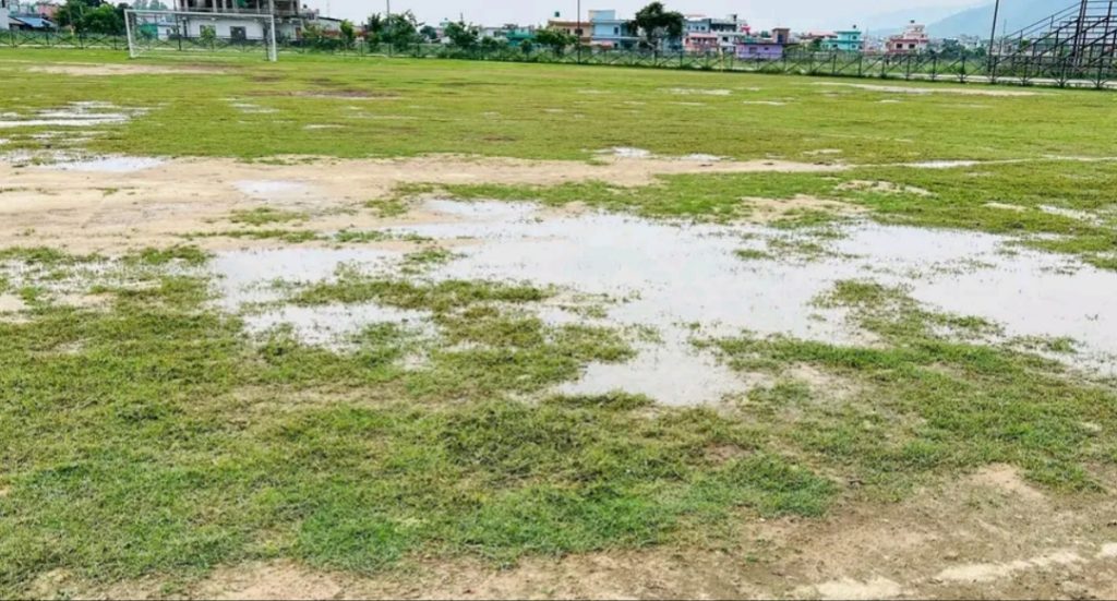 सोमबार भएको वर्षाको कारण पानी जमेर प्रभावित परेको पिप्ले-क्याम्पा रङ्गशालाको खेल मैदान । फाइल तस्वीर