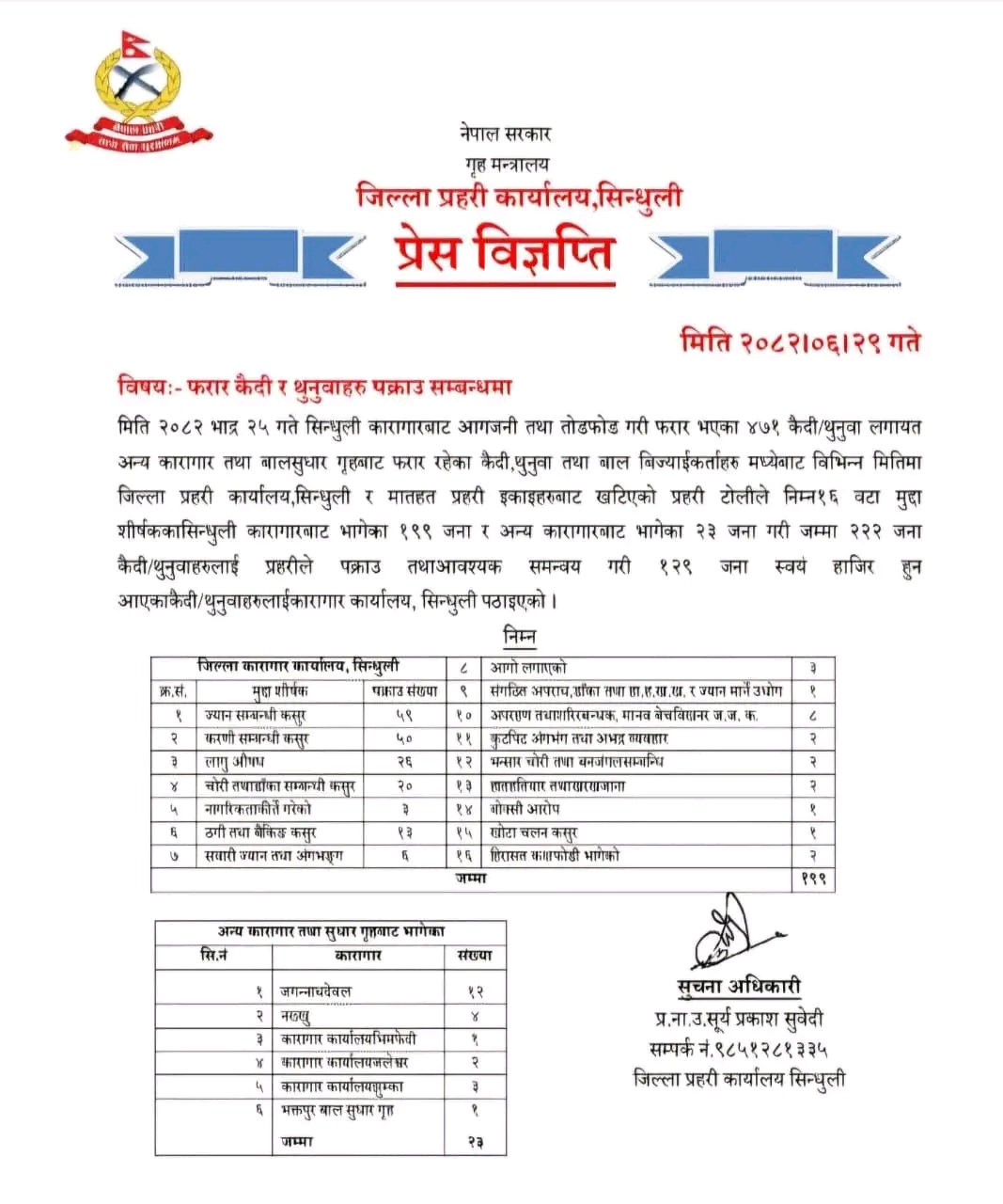 जिल्ला प्रहरी कार्यालय सिन्धुलीका अनुसार फरार कैदीहरुलाई विभिन्न मुद्दामा पक्राउ गरिएको हो। उनीहरूमाथि आगजनी, ज्यान सम्बन्धी कसुर, करणी, अपहरण, लागु औषध, चोरी, ठगी, भन्सार चोरी, सवारी ज्यान तथा अन्य अपराधका आरोप थिए। आवश्यक समन्वय र अनुसन्धान पछि १सय२९ जना स्वयं कारागारमा हाजिर भएका छन्।