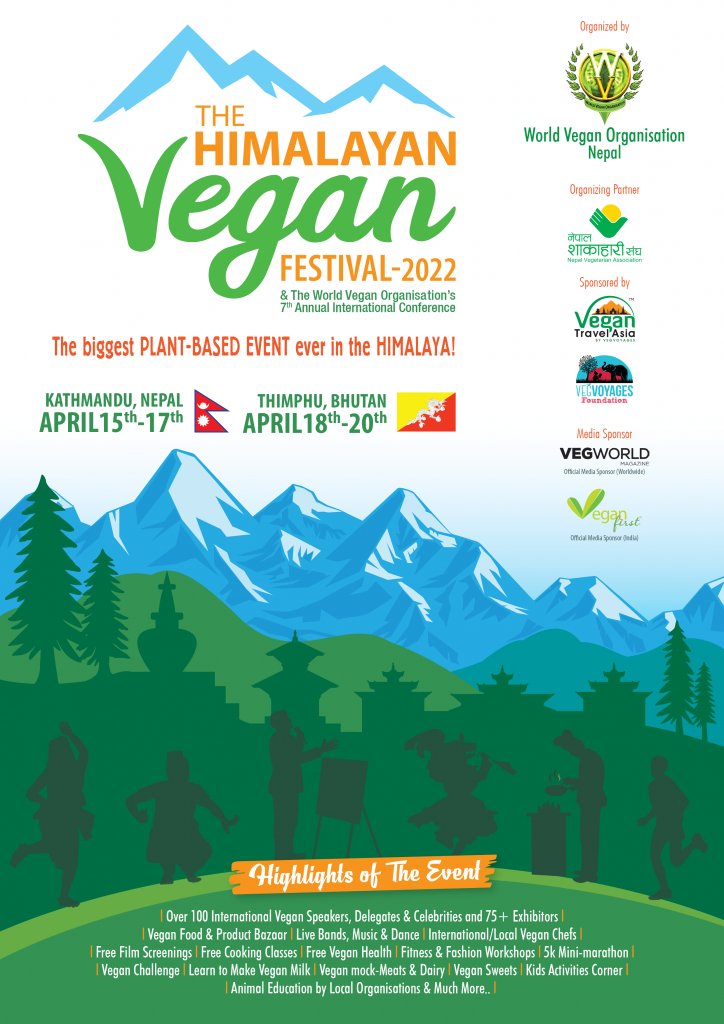 हिमालय क्षेत्रका विशुद्ध शाकाहारी जीवनशैली र करुणामय जीवन अभ्यासको ज्ञान तथा सचेतनाबारे प्रसारप्रसार गर्न ‘हिमालयन भीगन महोत्सव २०२२’ हुने भएको छ । वल्र्ड भीगन अर्गनाइजेशनले यहाँ पत्रकार सम्मेलन गरेर महोत्सवका बारेमा जानकारी गराएको हो । नेपालमै पहिलोपल्ट गर्न लागिएको सो महोत्सव काठमाडौँ, लुम्बिनी र पोखरामा हुने अर्गनाइजेशनका अध्यक्ष सुरेशप्रसाद शर्माले जानकारी दिनुभयो ।