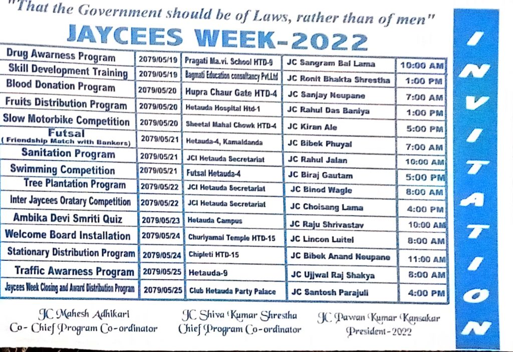 आइतबारबाट सप्ताहव्यापी कार्यक्रमको आरम्भ गरि २५ गते पुरस्कार वितरण तथा जेसीज सप्ताह कार्यक्रम समापन कार्यक्रम रहेको हेटौंडा जेसीजका अध्यक्ष पवनकुमार कंसाकारले बताए ।