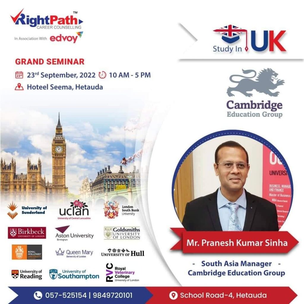 हेटौंडा स्थित सिमा होटलमा युके र क्यानडा लगायत गन्तव्यहरू बाट आउने प्रतिष्ठित विश्वविद्यालयका प्रतिनिधिहरूले नेपाली विद्यार्थीहरूका जिज्ञासा समाधान गर्ने गरि उक्त सेमिनार हुने भएको हो ।