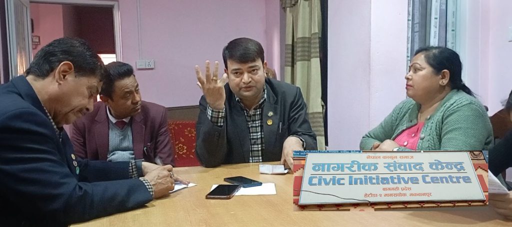 हेटौडा २ मा रहेको नागरिक संवाद केन्द्रको हलमा शुक्रबार मुलुकी देवानी संहिता, २०७४ र मुलुकी देवानी कार्यविधि संहिता २०७४ अन्तर्गत परिच्छेद ८ को धर्मपुत्र वा धर्मपुत्री सम्बन्धी व्यवस्थाबारे जानकारी मुलक कार्यक्रमको आयोजना गरिएको हो।