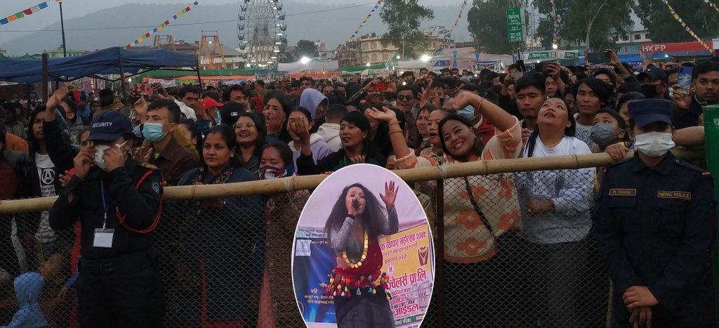 उनले आफ्नो सांगीतिक प्रस्तुती दिदैं युवायुवतीलाई छारो उड्ने गरी नचाएकी थिइन् । उनले व्याटल गीत गाउँदै सबै दर्शकलाई नचाएकी थिइन् । उनले तिमी जस्तो तिग्रे कति बिग्रेबिग्रे…, चौतारीका वरपिपल छायाँ…, बाबरी बाबरी…, न सम्पति न मेरो जीउडाल के को माया जाल… लगायत लोकभाका र झ्याउरे भाकाका गीतहरु प्रस्तुत गरेकी थिइन् । त्यस्तै गायक हेमन्त शर्मा र कृष्ण काफ्लेले आफ्नो सांगीतिक प्रस्तुती दिएका थिए ।