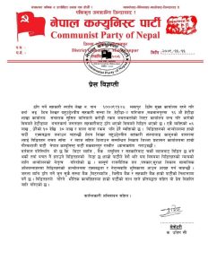 यसै विषयमा नेपाल कम्युनिष्ट पार्टीले एक विज्ञप्ति जारी गरिसकेको छ ।