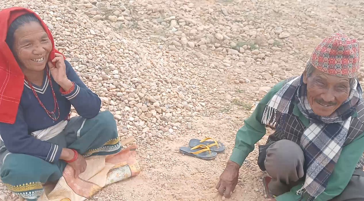 कुखरेनी खोलामा बालुवा खोतल्दै गरेको वृद्ध वृद्धाका जोडीले श्रीमान श्रीमती एक अर्काको सहारा बनेर काम गर्नुपर्ने बारे बताए ।