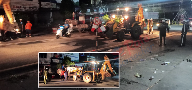 सडक छेउछेउमा भएका गमलाहरु हटाउन उपमहानगर डोजर सहित नगर प्रहरी प्रहरी, पुगेका हुन् ।