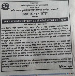 ३५ दिन भित्र सडक सिमा भित्र पर्ने संरचना नहटाए सडक डिभिजन हेटौंडाले प्रहरी प्रशासनको सहयोगमा हटाइने र लागेको खर्च सम्बन्धित व्यक्तिबाट असुल्ने जनाइएको हो ।