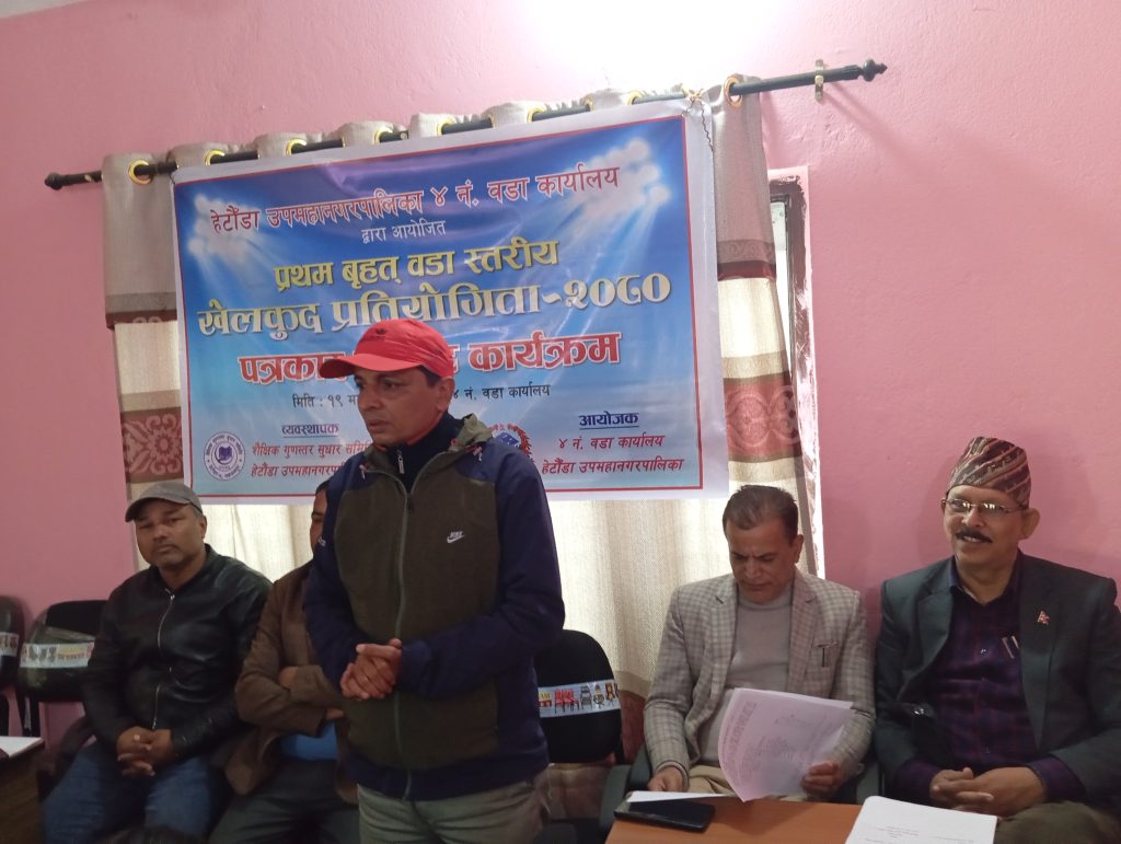 शुक्रबार वडा कार्यालयको सभाहलमा पत्रकार सम्मेलनको आयोजना गर्दै आउदो माघ २६ र २७ गते हेटौंडा -४ स्थित हुप्राचौरमा खेलकुद प्रतियोगिता हुने भएको जानकारी गराइएको हो ।