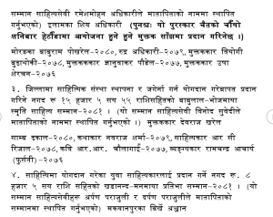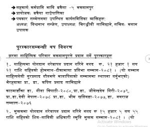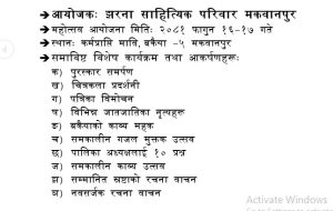 मकवानपुरको बकैया – ५ स्थित कर्मप्राप्ति माविमा गरिने कार्यक्रममा साहित्यमा आवद्ध श्रष्ठा, पत्रकार, साहित्यमा नवश्रजक सम्मान ,चित्रकला प्रदर्शनी, पत्रिका विमोचन, विभिन्न जातजातिका नृत्यहरू, बकैयाको काव्य महक,समकालीन गजल मुक्तक उत्सव हुने झरनाका सचिव मसान उपासकले बताए ।