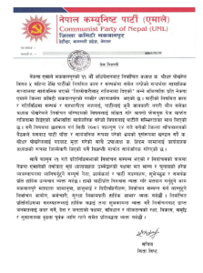 यसैविच सचिव सिता विष्ट द्धारा हस्ताक्षर पत्र जारी गर्दै पार्टीको नियमित काम र गतिविधिमा सम्पर्क र सहभागीता नजनाई पार्टीलाई कुनै जानकारी नगरी मौन बसेका अध्यक्ष पोखरेलले निर्वाचन परिणामको विषयलाई लक्षित गरि आफ्नो फेसबुक पेज मार्फत राजिनामा दिईएको अभिव्यक्ति सार्वजनिक गरेको विषयलाई पार्टीले गम्भिरताका साथ लिएको जनाएको हो ।