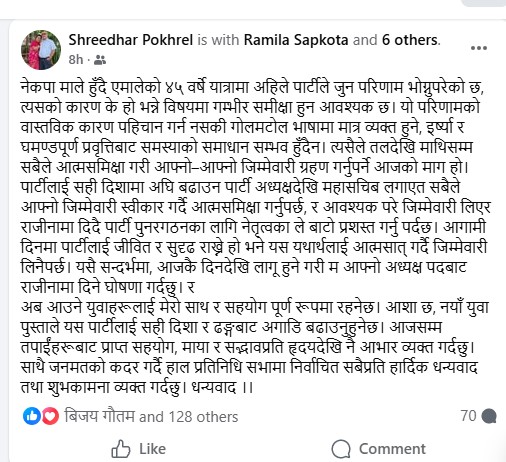 पार्टी अध्यक्ष रहेका पोखरले सामाजिक सञ्जाल फेशबुक मार्फत नेकपा माले हुँदै एमालेको ४५ वर्षे यात्रामा पार्टीले जुन परिणाम भोग्नुपरेको त्यसको कारण के हो भन्ने विषयमा गम्भीर समीक्षा हुन आवश्यक रहेको उल्लेख गरेका हुन् ।